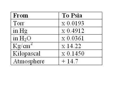 Convert application pressure units to P in psia Add 14.7 to psig value